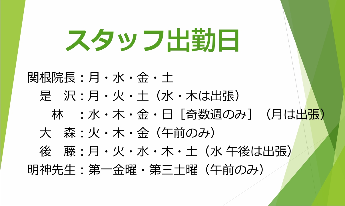 ホームページのトップページを下までスクロールしていただくと、出張など最新の状況が確認できますので、そちらもご覧ください。